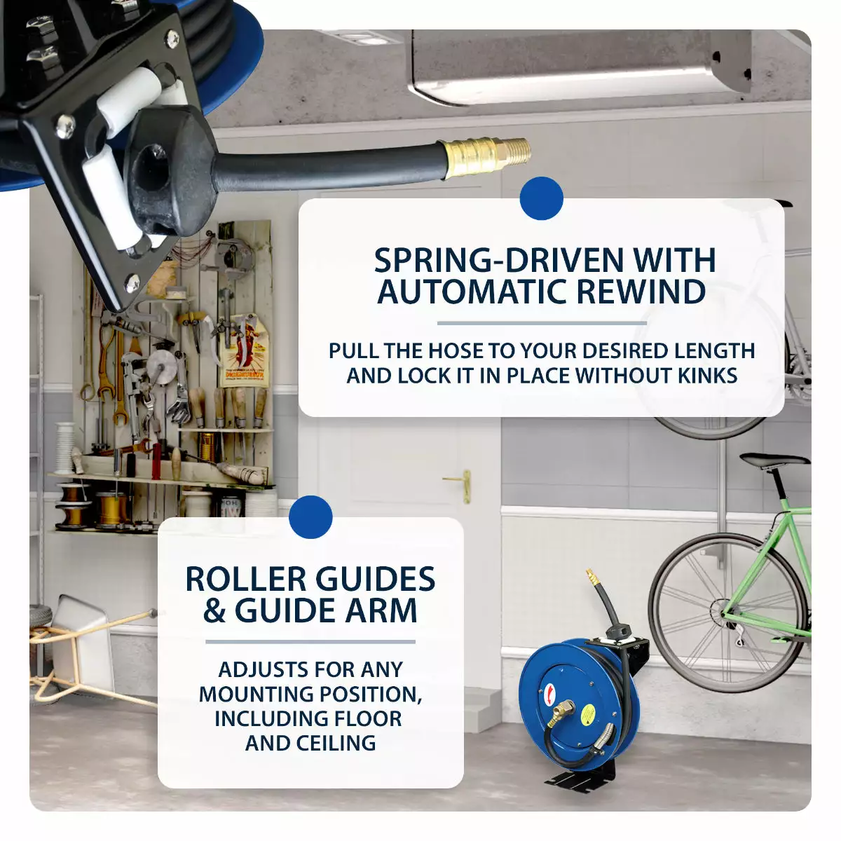 - SPRING-DRIVEN HOSE REEL: Allows you to pull the hose to your desired length and lock it in place without any kinks