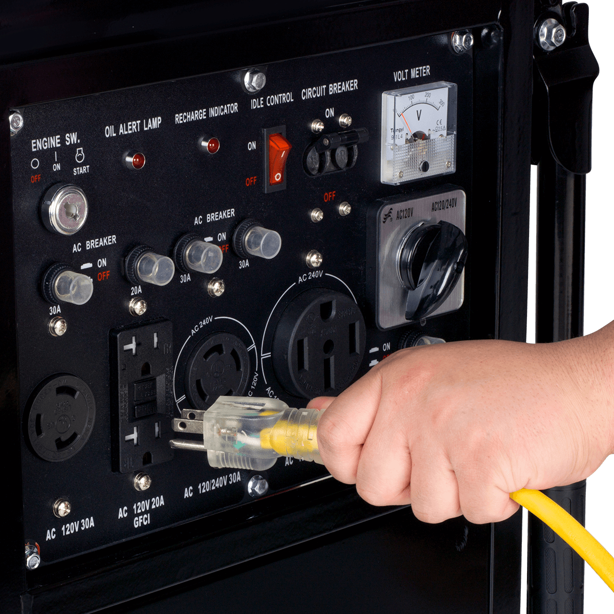 generator when an unsafe level of carbon monoxide is detected. - FULLY LOADED POWER PANEL: This generator comes equipped with four 120V 20AMP GFCI outlets, one 120V 30AMP twist lock, one 120 / 240V30AMP twist lock, and one 120 / 240V 50AMP heavy-duty transfer switch-ready outlet. Includes individual circuit breakers, idle control, and a low oil sensor.