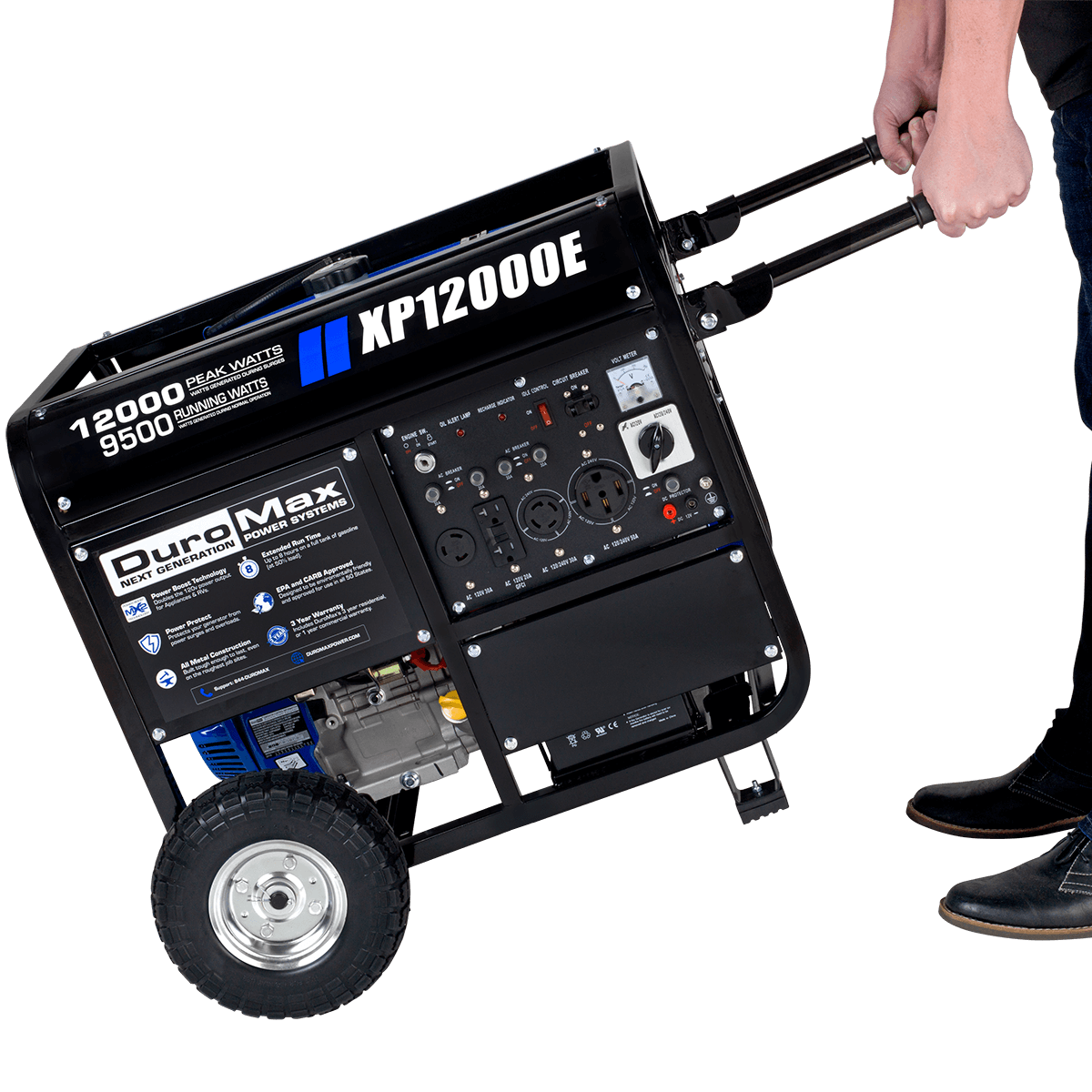 The XP12000DX is the BEAST of our new lineup, with 12,000 peak watts and 9,500 running watts. Powered by our DuroMax 457cc OHV engine, these generators are the PERFECT HOME POWER BACKUP solution and will run your household essentials such as lights, appliances, and central AC system with EASE during a blackout, storm, or emergency event.