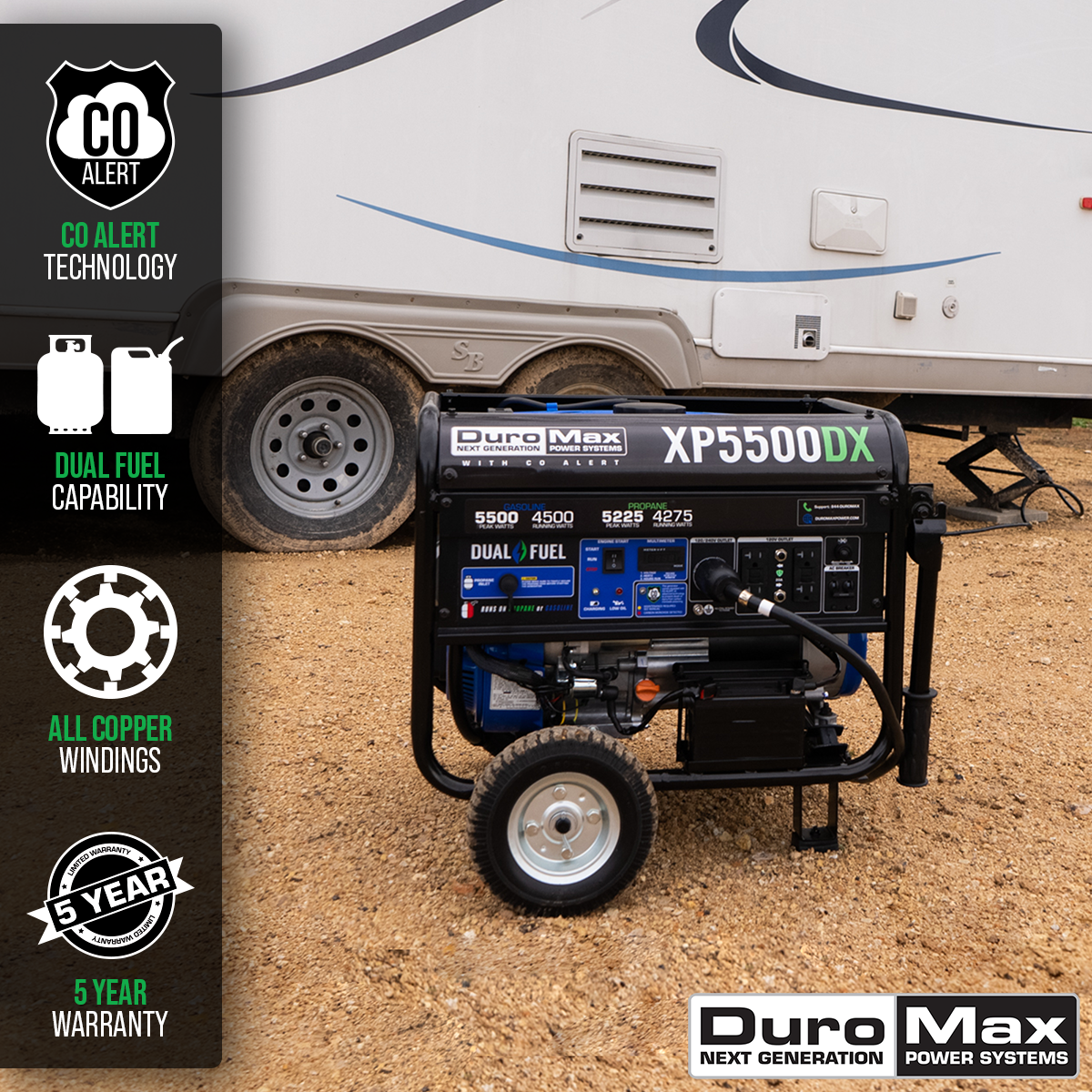 Our XP5500DX packs a punch with 5,500 peak watts and 4,500 running watts of compact Dual Fuel power. Powered by our 224cc DuroMax engine, this generator is excellent for camping, RVs, power on the jobsite, and will run various household essentials such as lights and appliances when the power goes out.