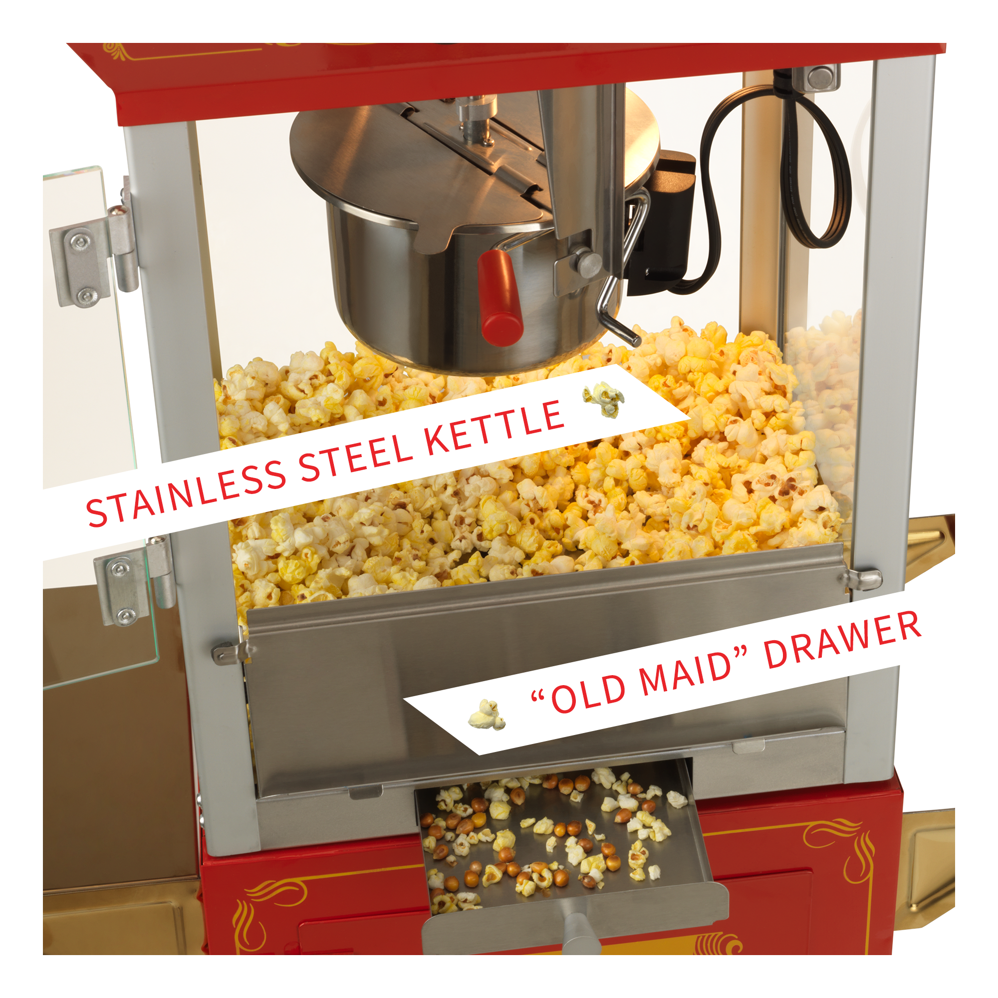 - โOLD MAIDโ DRAWER: Cutouts in the deck of the unit allow for easy removal of unpopped kernels. Simply open the tray to remove kernels and small debris.