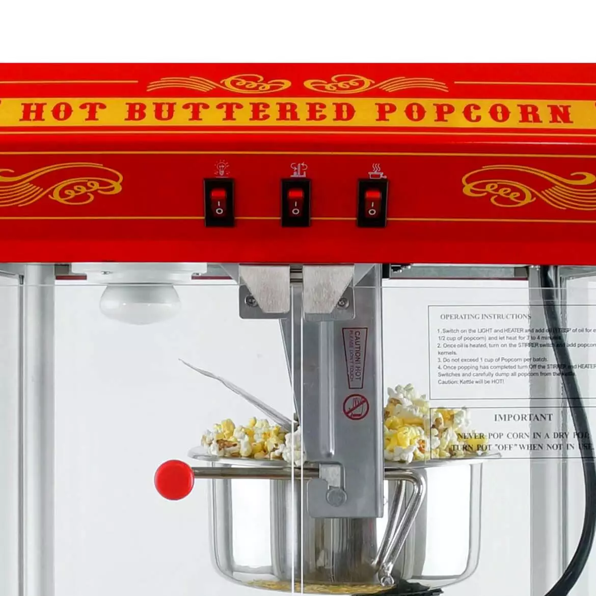 - WARMING LIGHT & HEATED DECK: Keeps the interior of the machine at a constant temperature to ensure your popcorn stays hot and fresh for hours.