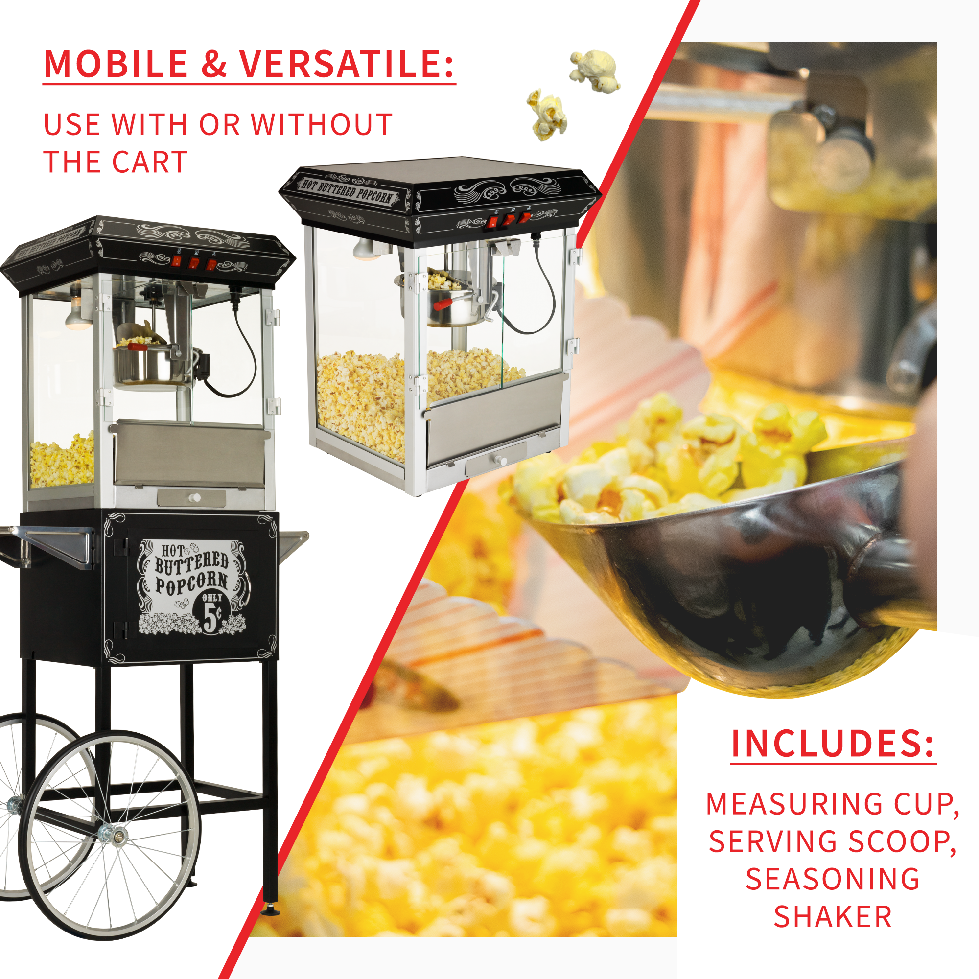 - BUILT FOR MOBILITY & VERSATILITY: Large, bicycle-style wheels allow for smooth mobility and easy portability. This model can be used with or without the cart โ the popcorn machine is detachable and can be placed on counters and bar/tabletops.