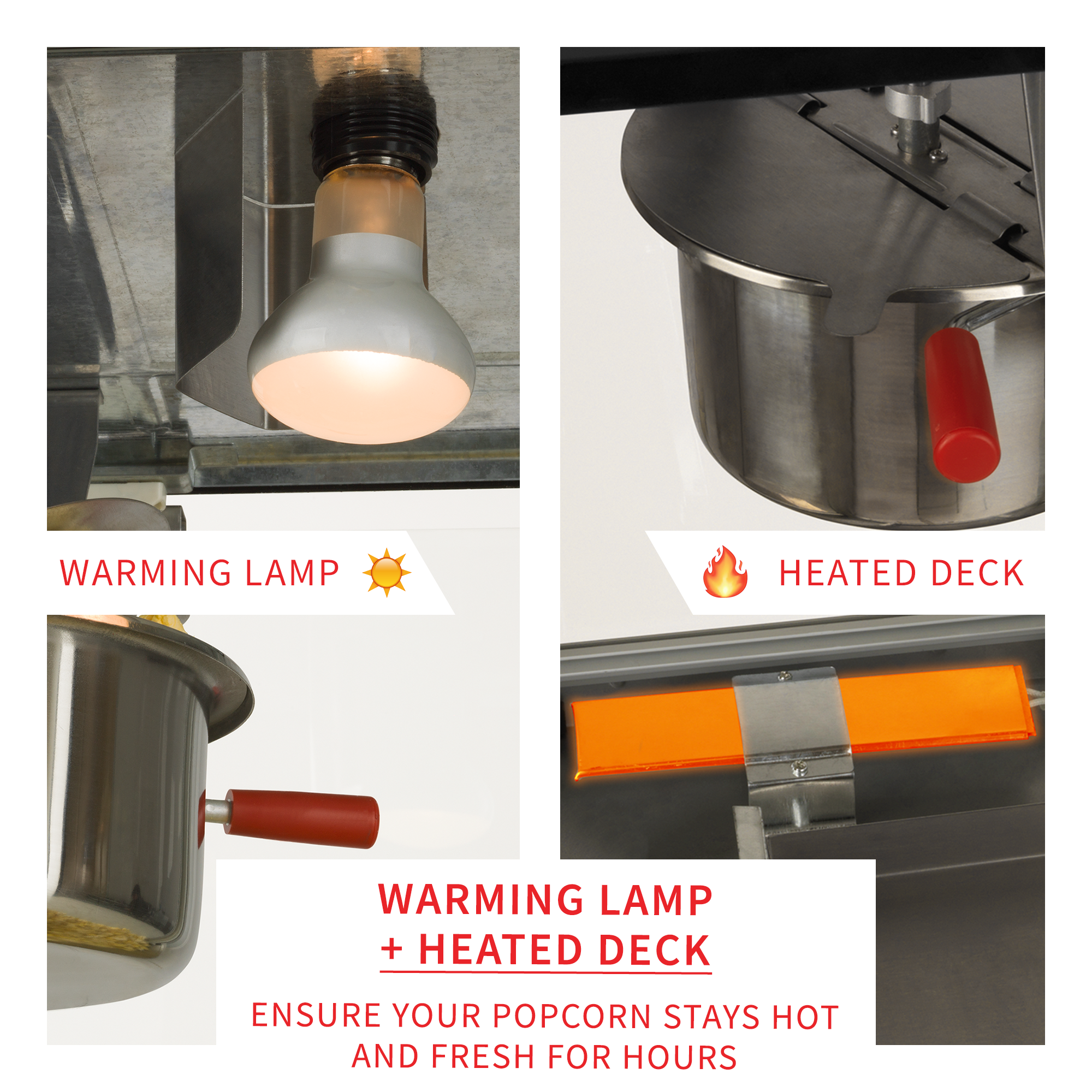 - WARMING LIGHT & HEATED DECK: Keeps the interior of the machine at a constant temperature to ensure your popcorn stays hot and fresh for hours.