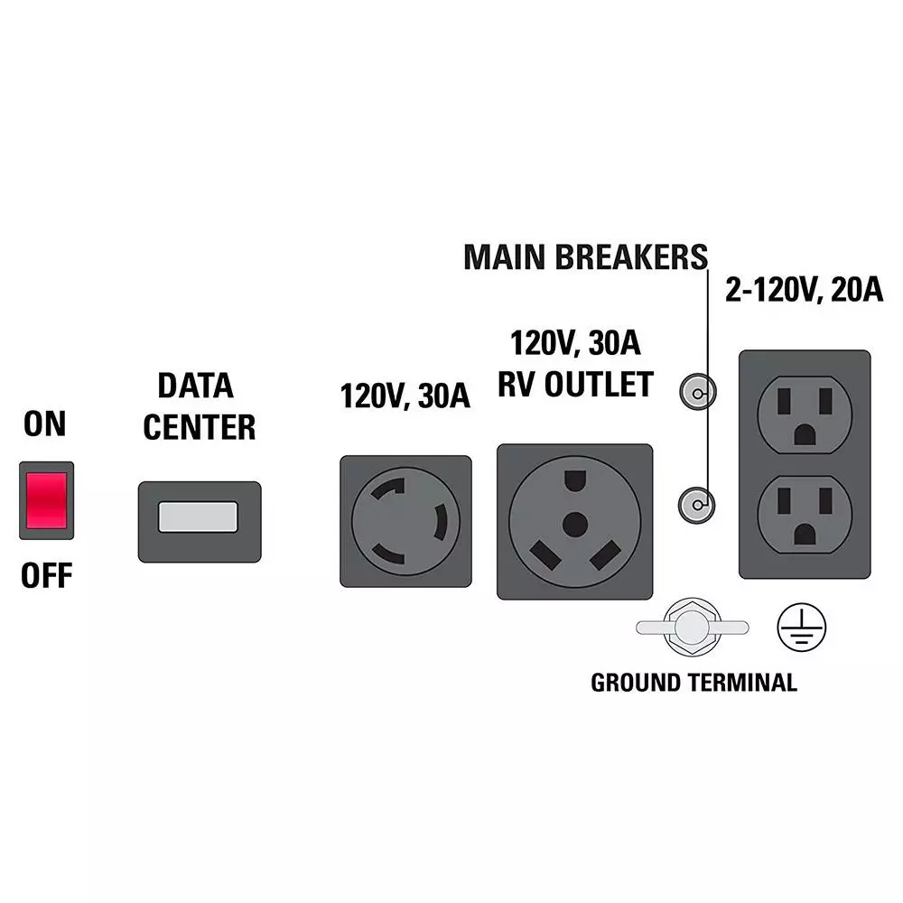 - Covered outlets include: One 120-Volt 30 Amp locking, one 120-Volt 30 Amp RV and two 120-Volt 20 Amp household.
