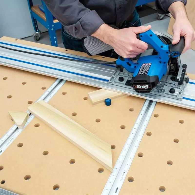 - MDF and aluminum table designed to support and position solid wood and plywood while cutting with the Kreg Adaptive Cutting System Plunge Saw and Guide Track