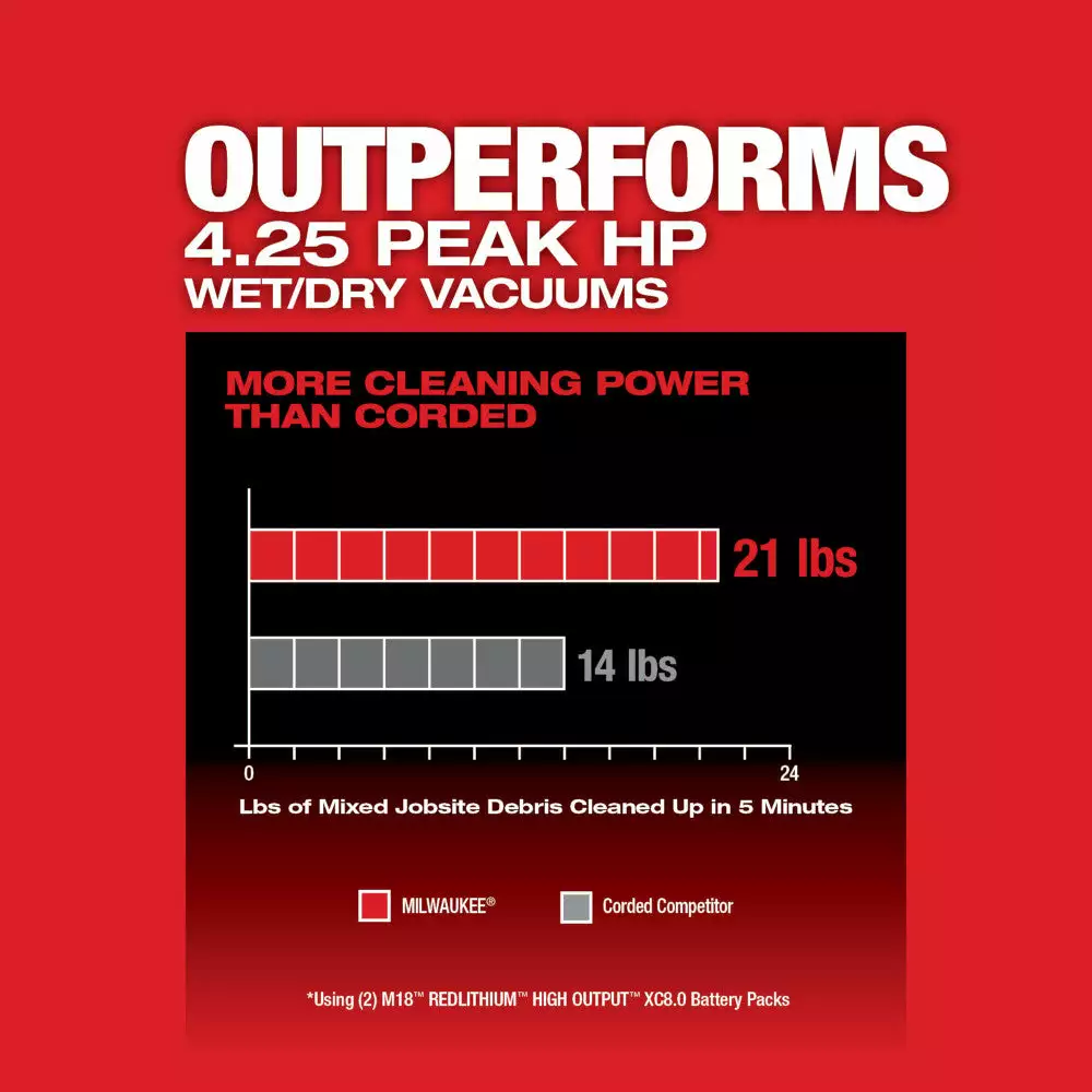- MAX POWER MODE delivers up to 34 minutes of continuous cleaning time, and up to 1,400 ft2 of debris clean up per charge on (2) M18 REDLITHIUM HIGH OUTPUT HD12.0 Battery Packs
