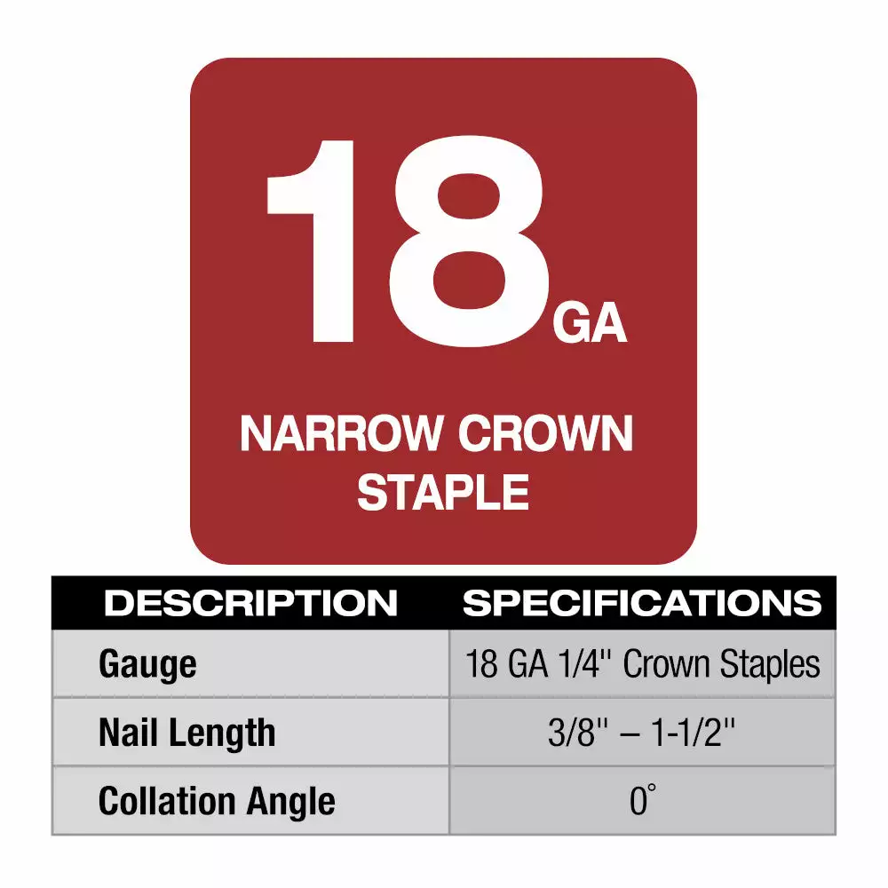 | Staple Type | 18ga 1/4 in. Narrow Crown |