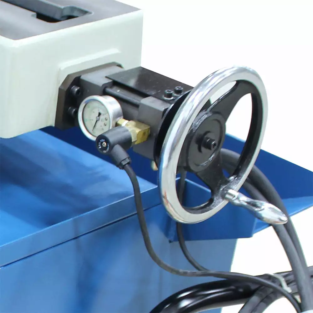- Industrial-grade hydraulic system clamps the vise, lowers the head, then raises the head back up after the cut is done.