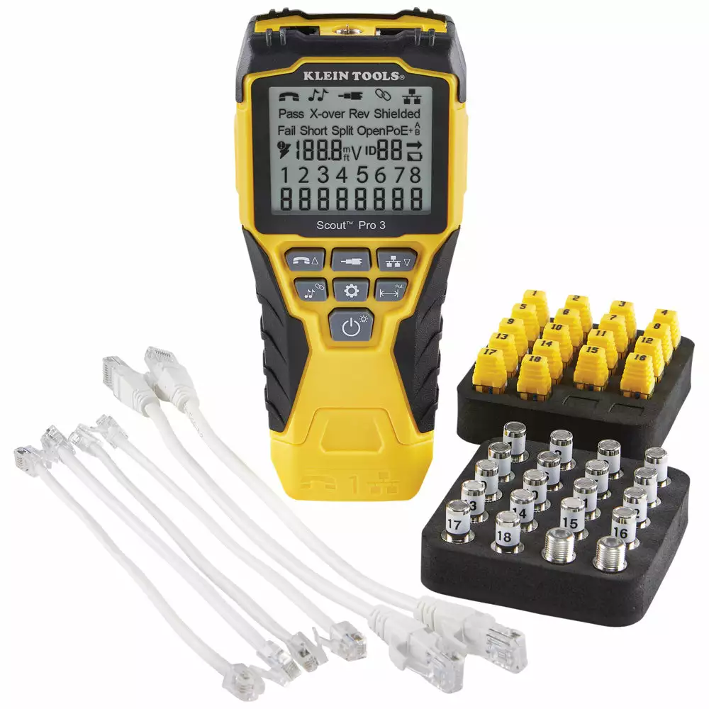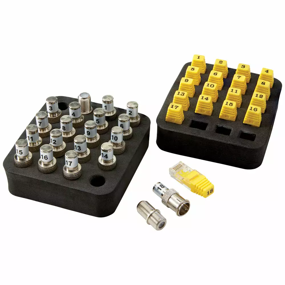 - Includes 1 Self-storing Test + Map Remote (31), 18 RJ45 LAN locator remotes, 18 F coax locator remotes, 2 female-to-female coax adapters and a 9V battery