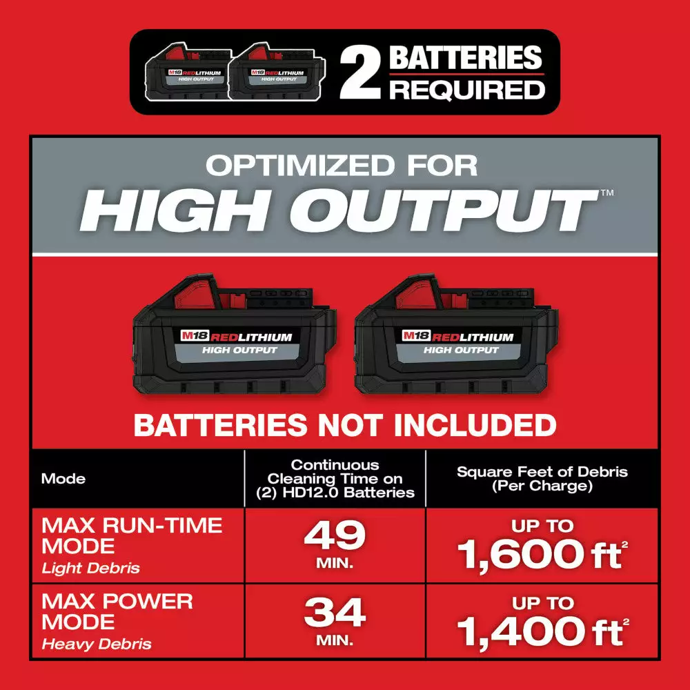 - MAX POWER MODE delivers up to 34 minutes of continuous cleaning time, and up to 1,400 ft2 of debris clean up per charge on (2) M18 REDLITHIUM HIGH OUTPUT HD12.0 Battery Packs