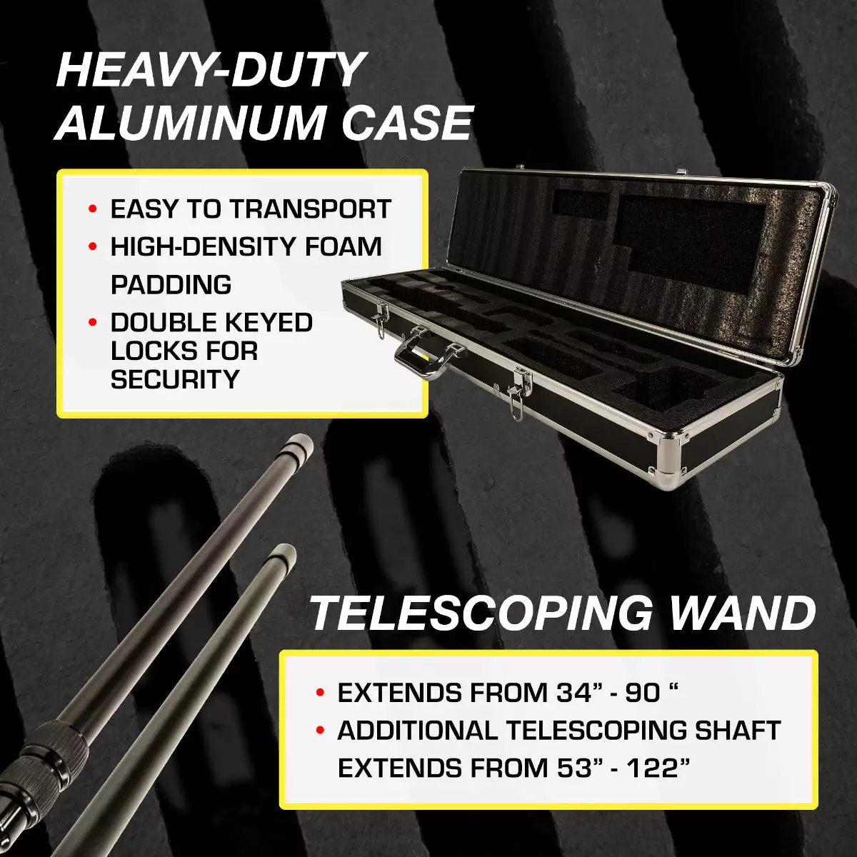 - heavy-duty aluminum case with foam padding